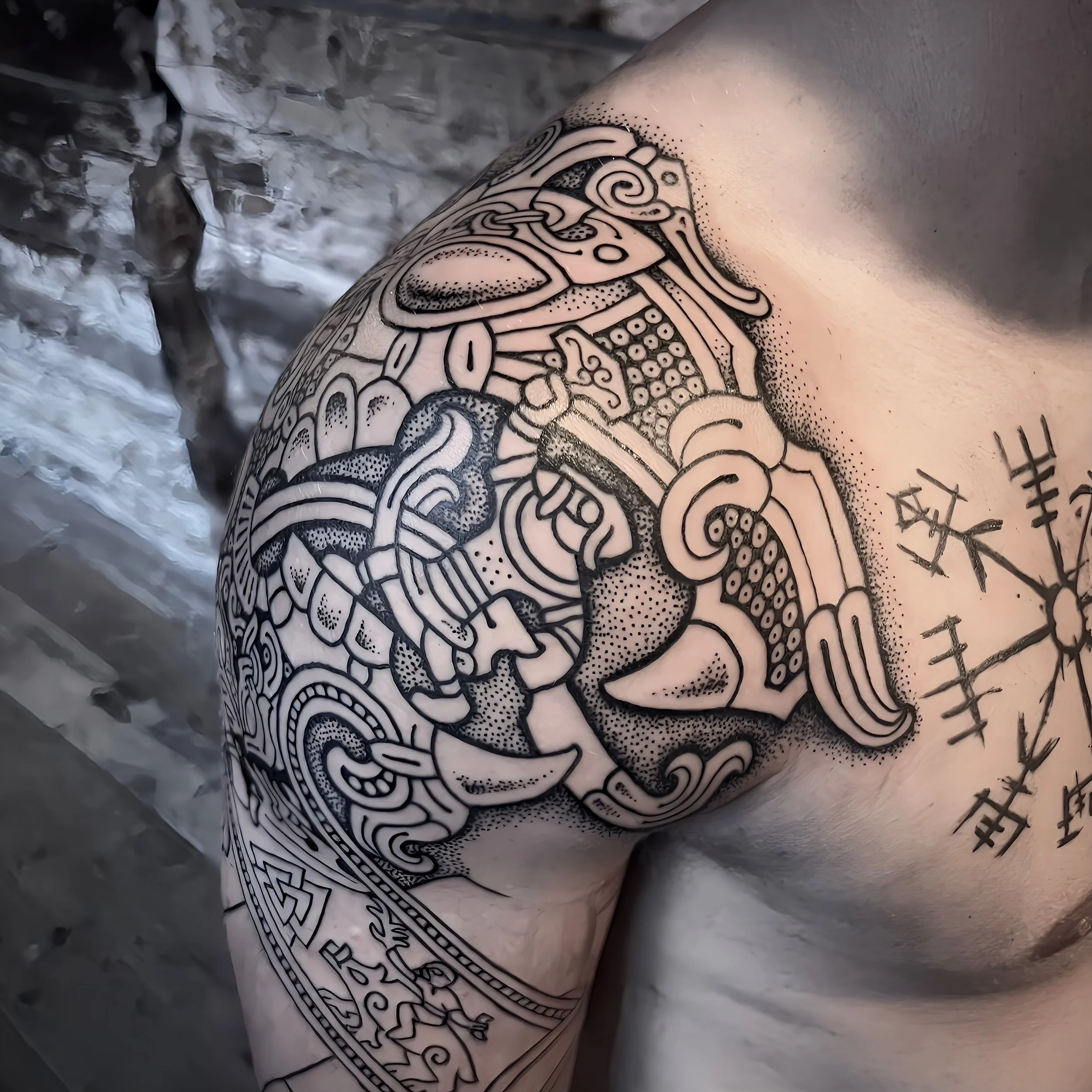 Ash is known for his ability to make Nordic, Celtic, and Geometric pieces flow with the body, which is why so many travel to him from abroad for full suits and sleeves.
